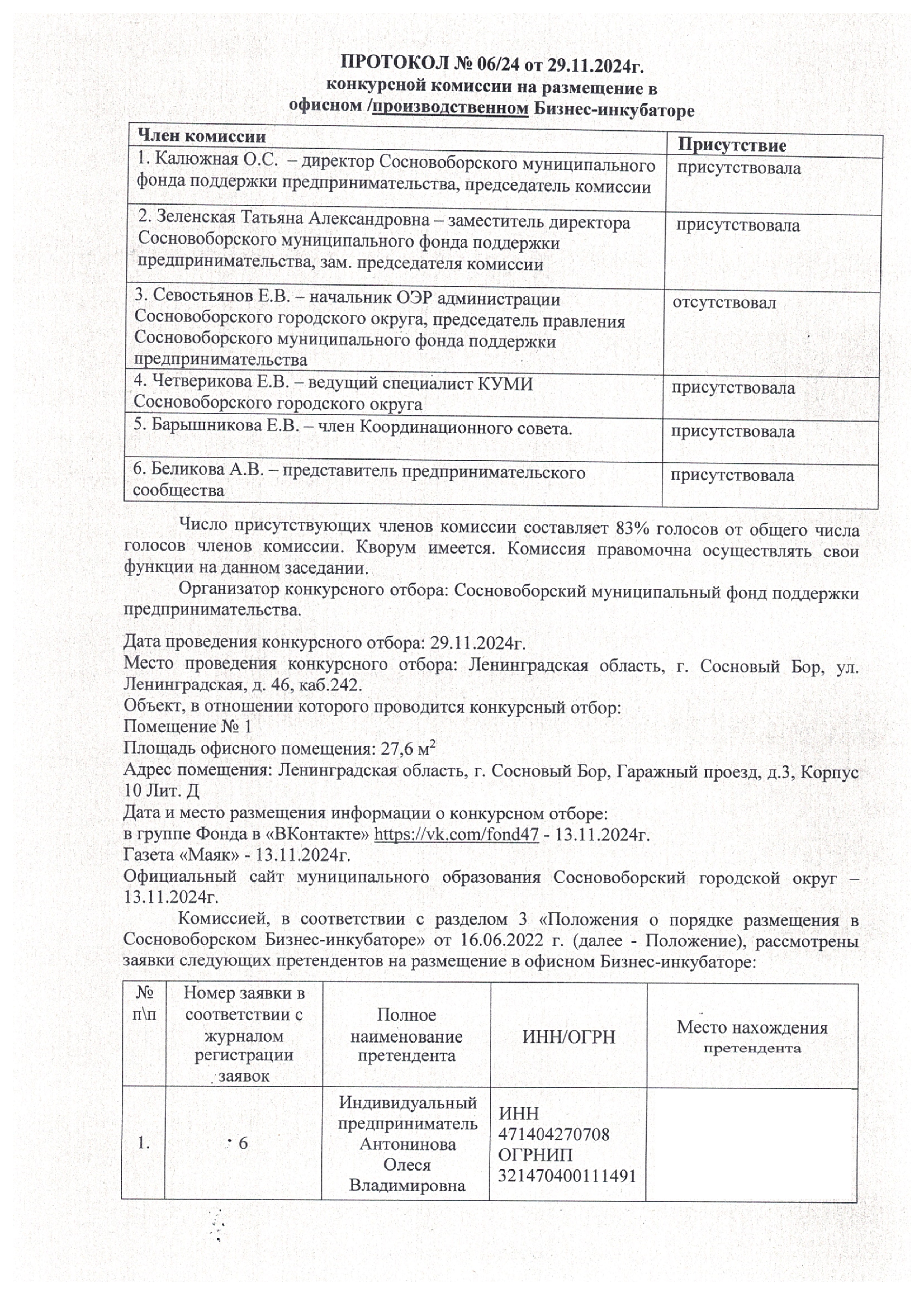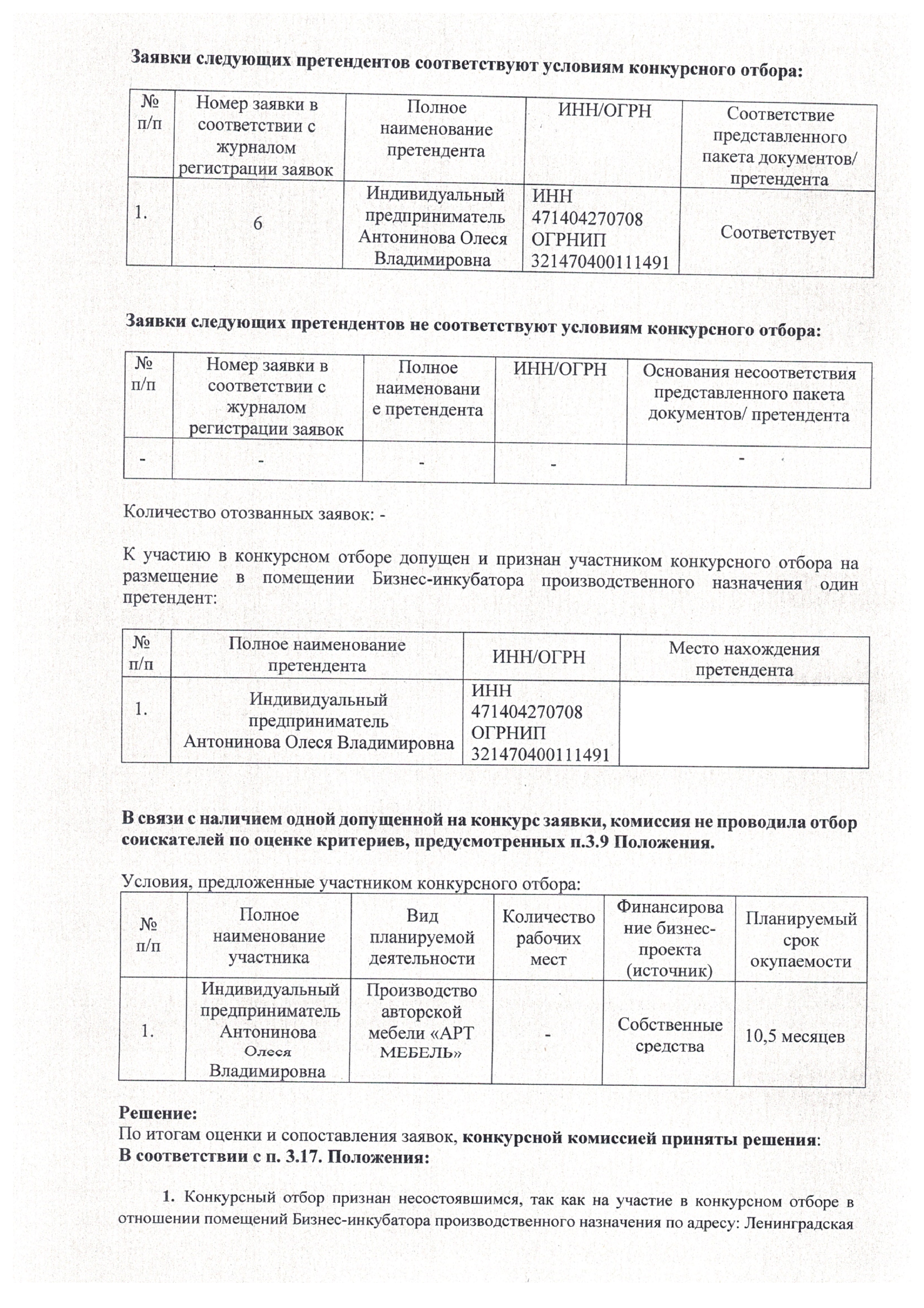 29 ноября 2024г. состоялось заседание конкурсной комиссии на право заключения договоров субаренды на размещение в Бизнес-инкубаторе. Объект, в отношении которого проводился конкурсный отбор: Бизнес-инкубатор производственного назначения: - местонахождение: г. Сосновый Бор, Гаражный проезд, д.3, Корпус 10 Лит.Д. - общая площадь помещения - 27,6 кв. м. По итогам заседания конкурсной комиссии право на заключение договора субаренды принадлежит ИП Антониновой О.В. (Протокол заседания конкурсной комиссии: №06/24 от 29.11.2024г.).